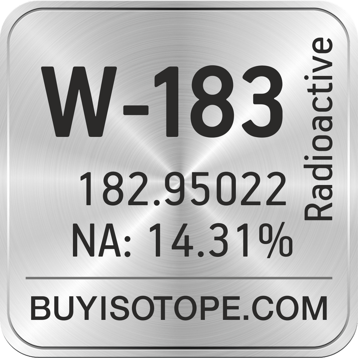 W-183 isotope is available to order from BuyIsotope.com in W-183 metal powder (W) chemical form and in W-183 oxide (WO3) chemical form. Please contact us via request a W-183 quote BuyIsotope.com to order W-183 isotope, to get W-183 price and to buy W-183 isotope.