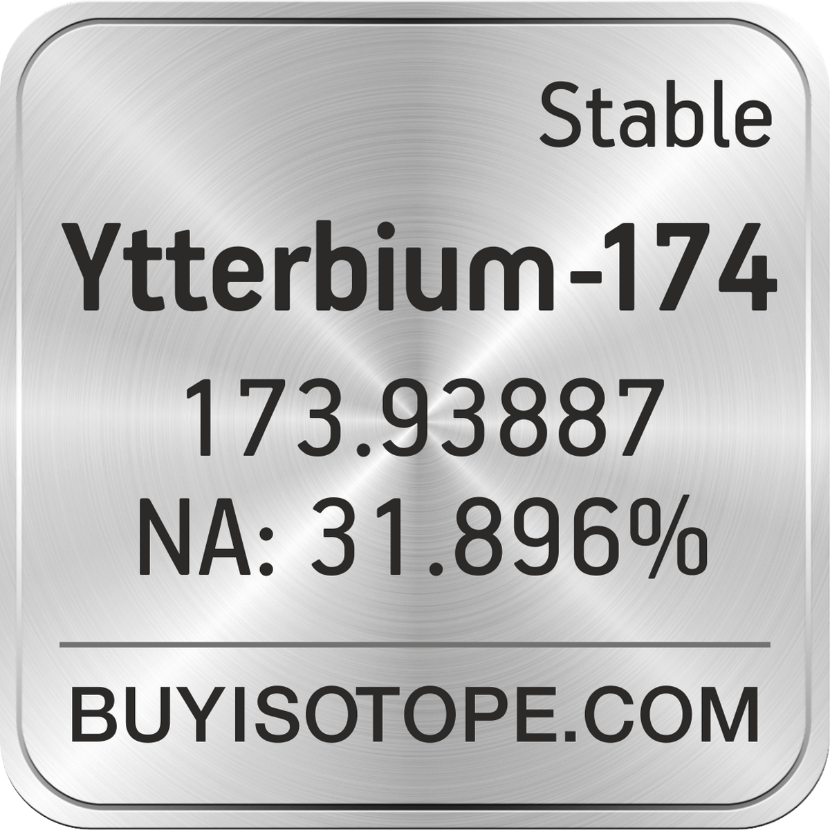 Ytterbium-174 isotope is available to order from BuyIsotope.com in Ytterbium-174 metal powder (Yb) chemical form and in Ytterbium-174 oxide (Yb2O3) chemical form. Please contact us via request a Ytterbium-174 quote BuyIsotope.com to order Ytterbium-174 isotope, to get Ytterbium-174 price and to buy Ytterbium-174 isotope.